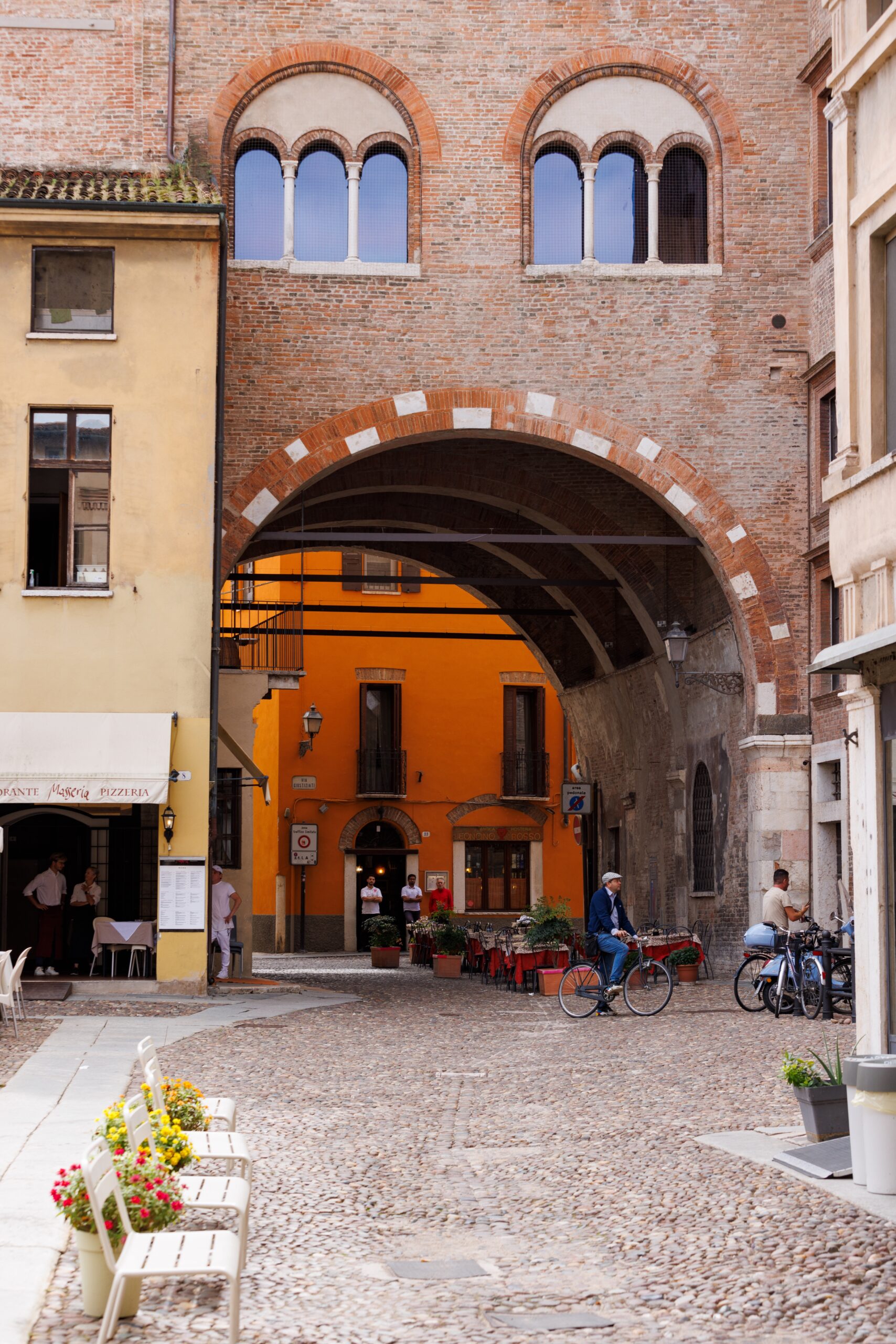 The Arengario was built in the 14th century to connect the Palace of the Podestà with the Palazzo del Massaro, thus connecting, via an elevated corridor, the place where politics were conducted to the place where the assets of the Municipality of Mantua were administered. The structure appears as a round arch, surmounted by a row of three-light windows and a loggia of nine small arches supported by marble columns. Pausing beneath the vault, it is still possible to see the iron rings used to torture condemned prisoners, a clearly visible message to anyone even intending to break the law.