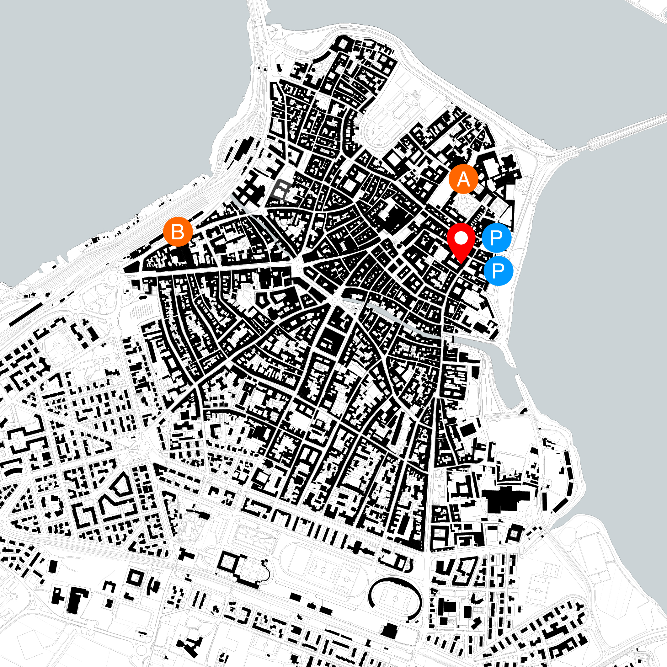 There's a large parking lot in Piazza Arche (shown on the map), which includes two reserved parking spaces. The parking lot is currently unavailable due to ongoing underground expansion work.