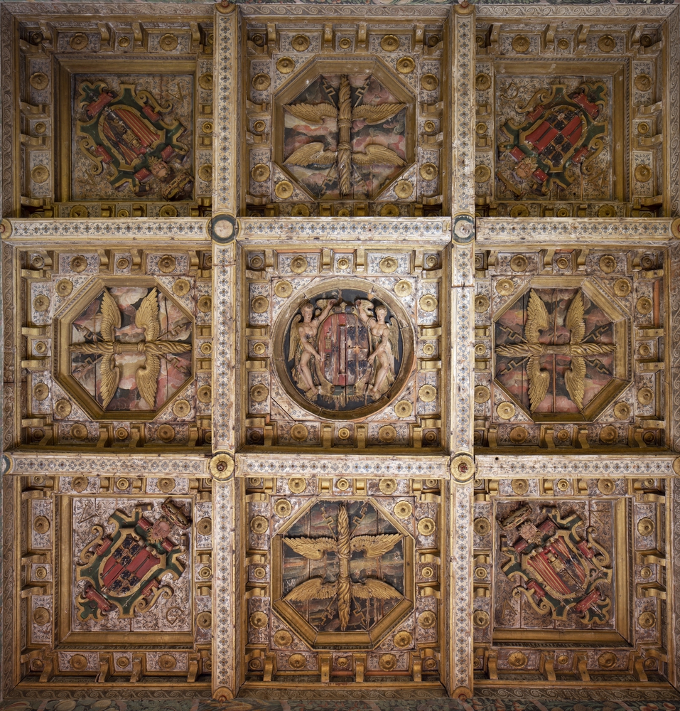 The first one represents the family crest Gonzaga, with the four eagles, together with that of the Column, a column on a red background. This image recalls Vespasiano's origins: his father was the condottiero Luigi Rodomonte Gonzaga and his mother was the noblewoman Isabella Colonna.