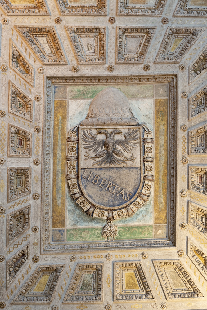 But the most interesting and most common in Sabbioneta is a shield featuring a double-headed eagle above the word "LIBERTAS," alluding to the independence and freedom of the Duchy of Sabbioneta from Mantua. From 1585, when Vespasiano was awarded the Order of the Golden Fleece, the coat of arms was enriched with the Order's collar around the shield.