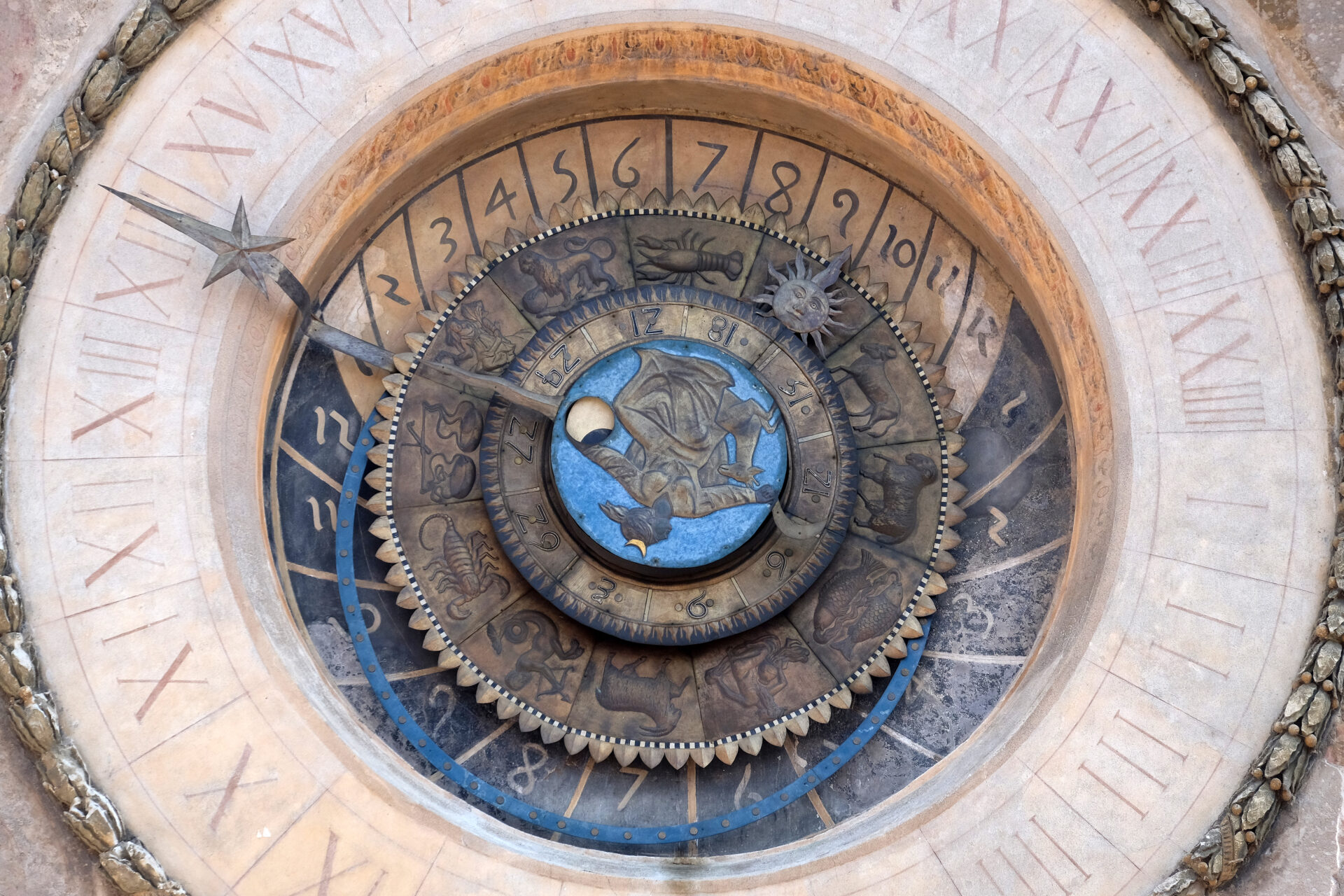 The clock originally displayed Italian time, which placed the beginning of the day at sunset. For this reason, the first hour is indicated on the right side of the dial, in the position where the setting sun can be seen. Further inward is the dial of the light and dark Planetary Hours, connected to the Celestial Equator (the thin blue circle with the gold dots): the combination of these two crowns and the Sun Hand allowed the user to determine which planet was ruling at a given hour. Further inward is the crown of the lunar month. In the center, a female figure, likely representing the goddess Leto, holds in her right hand the sickle indicating the lunar days and, in her left, the small circular window from which the lunar phases and the hand indicating the Moon's position in the zodiac can be read.