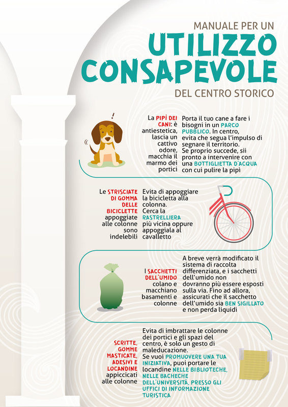 The porticos are a private property for public useThe columns that support them are privately owned, belonging to the corresponding shops. Under the porticoes, today as in the past, businesses operate, residents stroll sheltered from the elements and the sun, meet and stop at café tables, often unaware of the important artistic and cultural heritage they are interacting with. A thousand daily gestures, dictated by habit, leave marks that are difficult to erase and, over time, lead to a widespread state of decay.