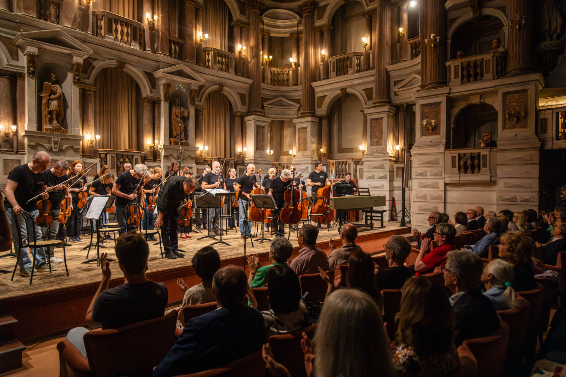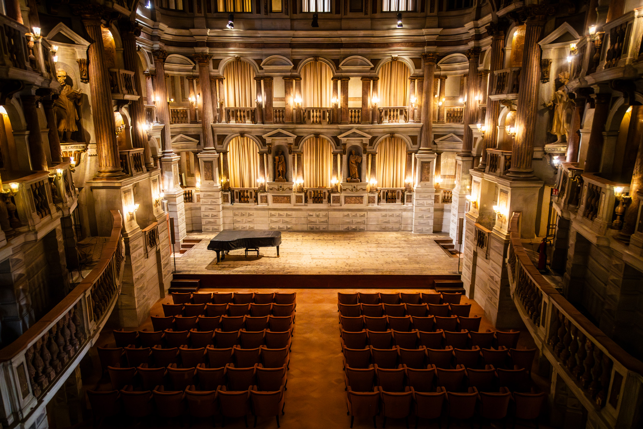 Il Teatro Scientifico Bibiena, in legno e stucchi, è molto diverso dai tradizionali teatri a gradinata rinascimentali, e si distingue per la sua pianta a campana e tre ordini di piccoli palchi a balconcino con colonne in stile dorico, ionico e corinzio. Il palcoscenico è chiuso da una scena fissa a forma di loggiato a due piani dove il pubblico può affacciarsi e assistere alle manifestazioni.